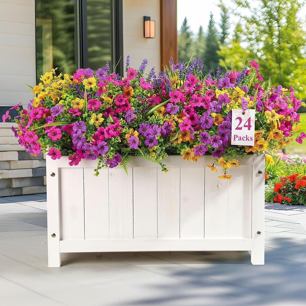 - 🌸【Perfect for Outdoor/Indoor】Plastic flowers are ideal for outdoor porches, walkway, terraces window box, front yard, pots ,hanging planters, gardens, landscape, windowsills, allow you have beautiful color all year around. Also suit for birthdays, weddings, memorial place or grave, they can live anywhere and have withstood heavy rain storms and winds.