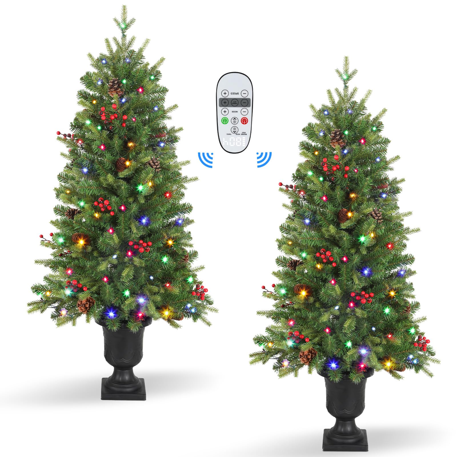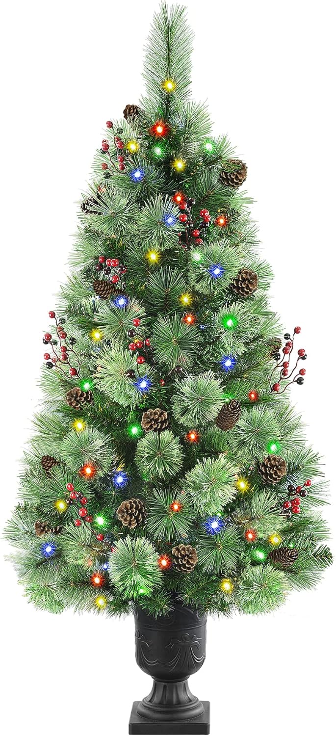- 🎄【Pre-Lit Design】Pre-installed 60 multicolor lights for each tree, you don’t need to install the lights string by yourself. Plus 10 pine cones and 10 red berries on the tree. look ultra-realistic, as charming as the natural. Easy and convenient and bring festive brilliance to your home.