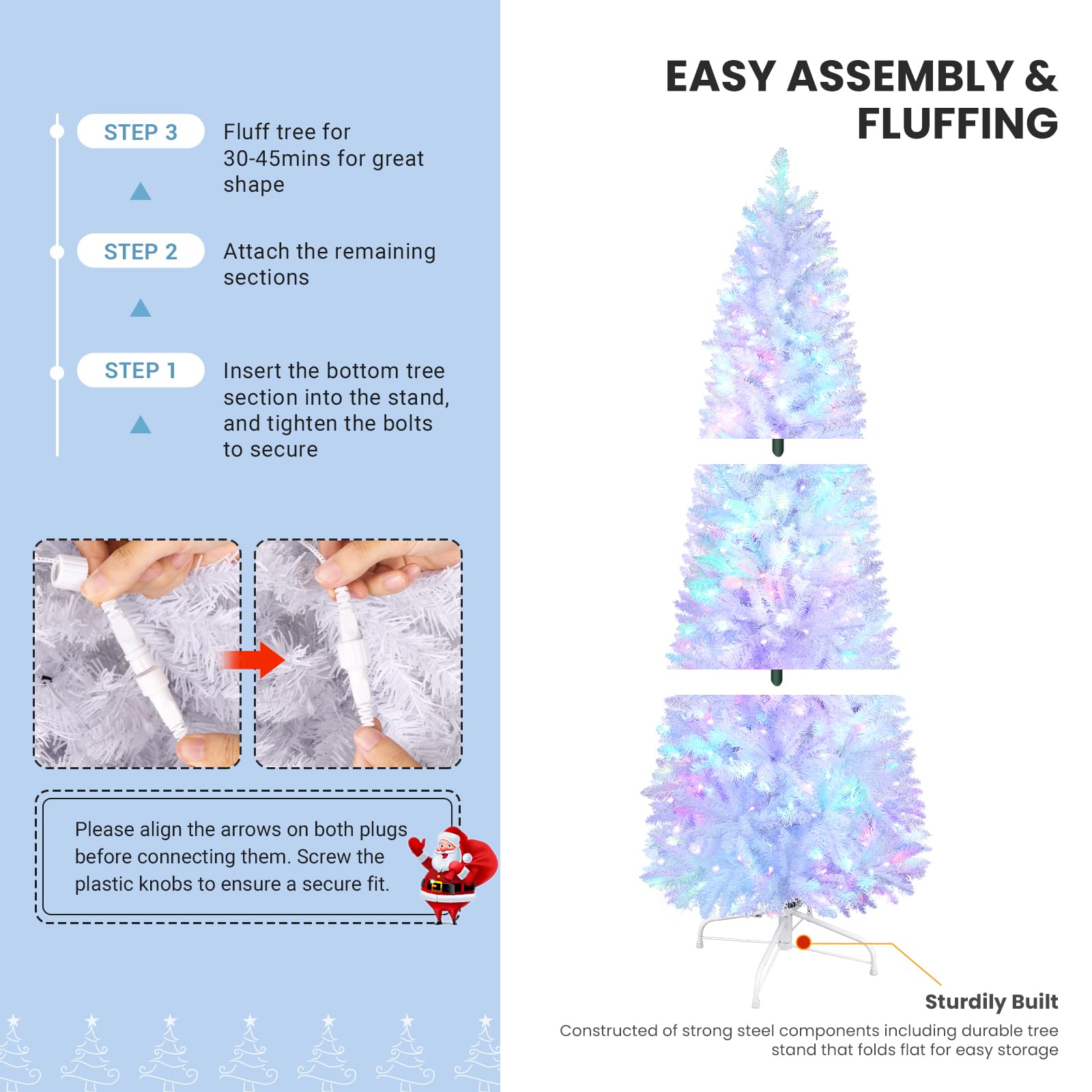 - 🎄【Easy to Install】The tree body is divided into 3 sections.You could easily install and disassemble the tree with the instruction.The durable steel stand can also be effortlessly connected to the tree body. No tools needed.