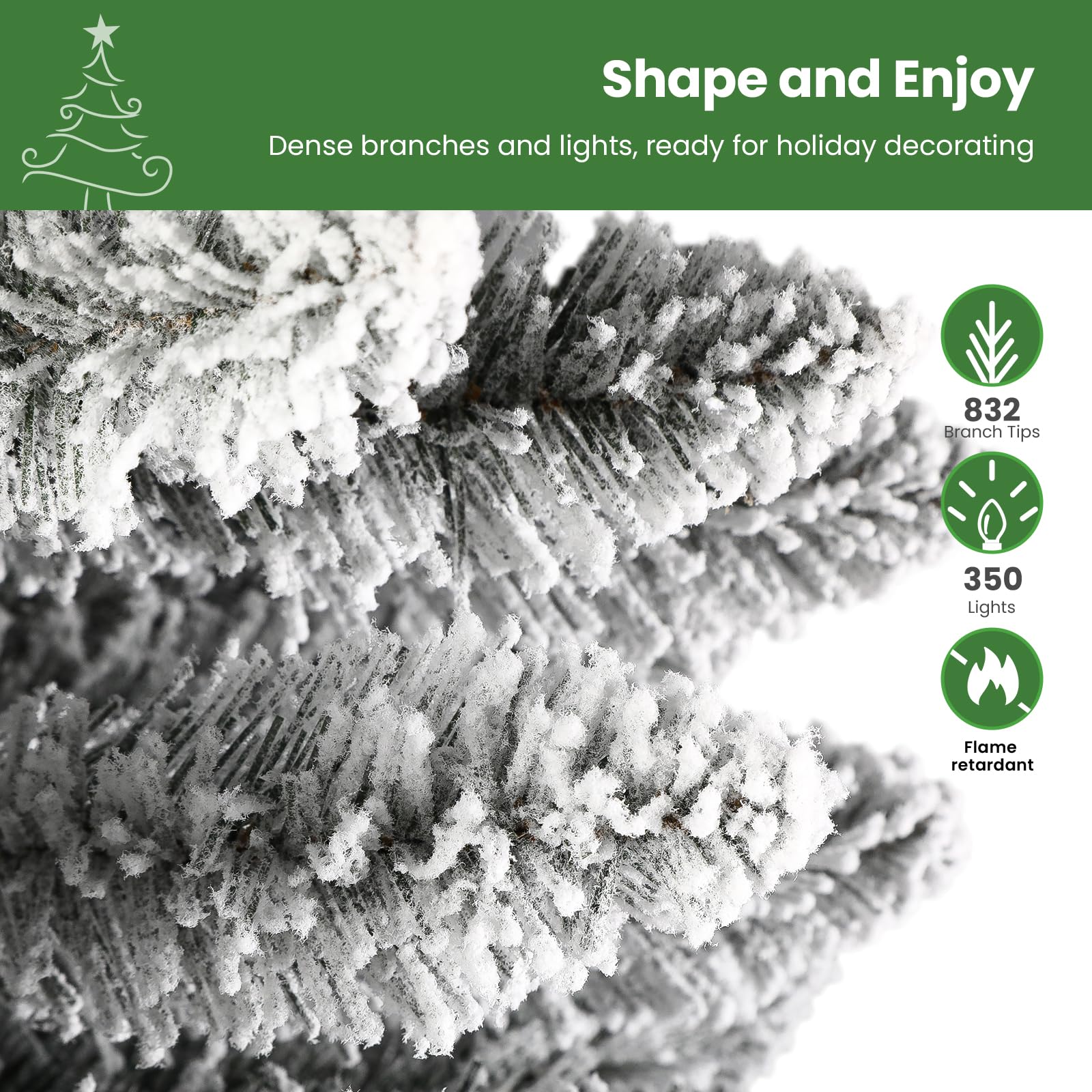 - 🎄【Ideal Size&Flocked Design】Standing 7.5 feet in height, It looks like real snow covered all 832 branches tips. You can enjoy a very warm and romantic Christmas holiday.